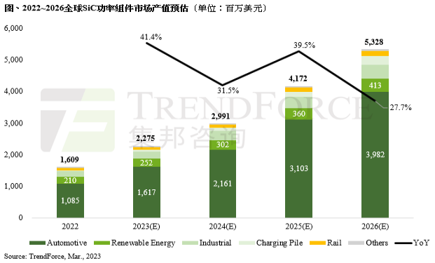 TrendForce集邦咨詢在調(diào)研報告中預(yù)測,隨著上述企業(yè)擴(kuò)產(chǎn)與應(yīng)用市場的明朗化,預(yù)計將推動2023年整體碳化硅功率元件市場產(chǎn)值達(dá)22.8億美元,年成長41.4%。至2026年碳化硅功率元件市場產(chǎn)值可望達(dá)53.3億美元。市場前景廣闊。