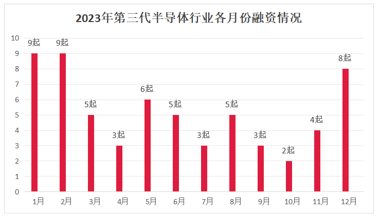 從融資時間來看,年初、年尾第三代半導(dǎo)體融資最火,1月、2月均分別發(fā)生9起第三代半導(dǎo)體融資事件,12月也至少有8起第三代半導(dǎo)體融資。